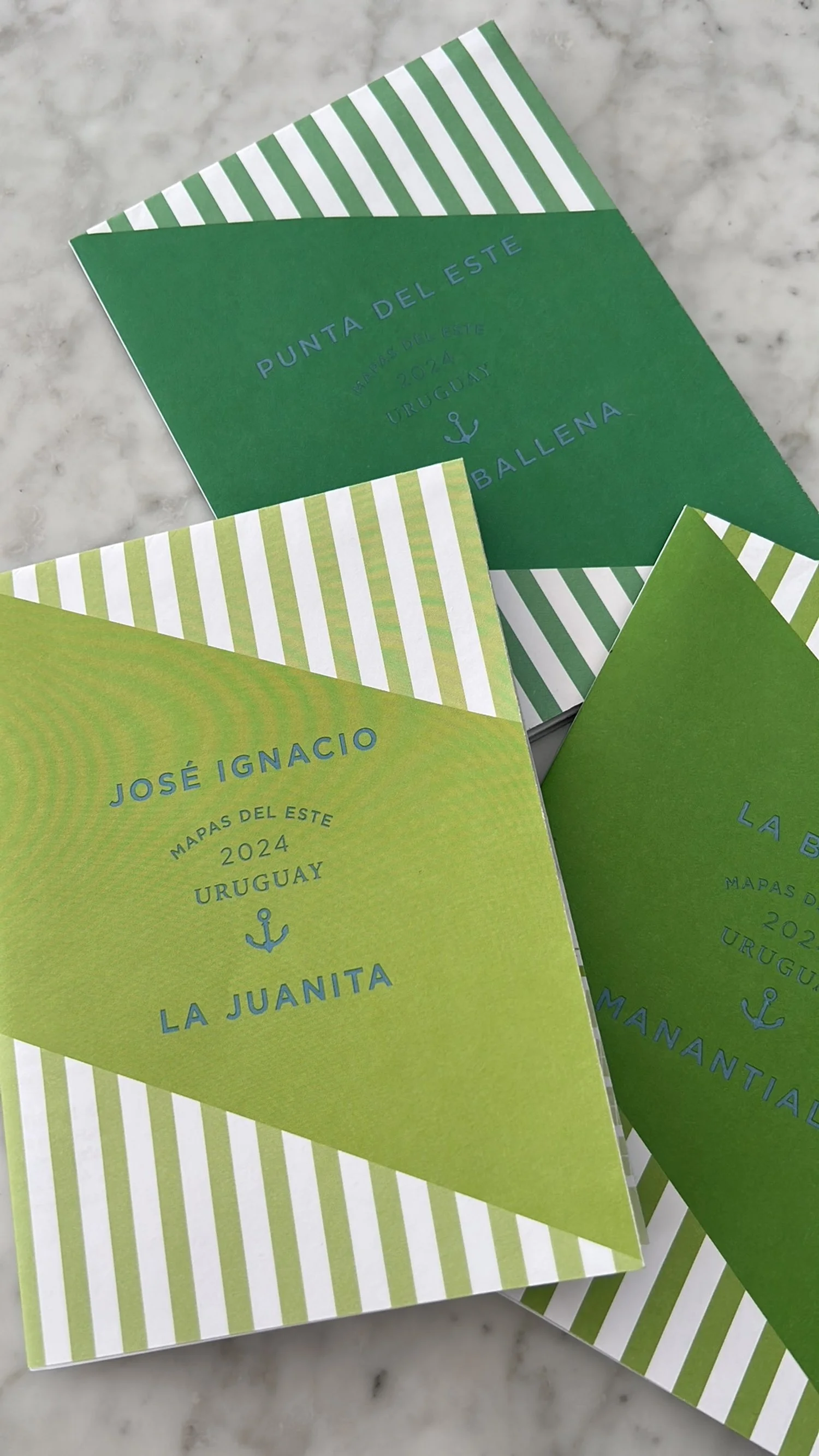 En 2024 elegimos usar tonalidades de verde para resaltar que Maldonado no es solo playa y mar, sino que su parte de campo, bosque y sierras es un atractivo turístico bello para disfrutar todo el año. También destacamos el uso del azul metalizado como color común, para no dejar de lado al mar. Este año decidimos usar una paleta monocromática en nuestros 4 mapas.